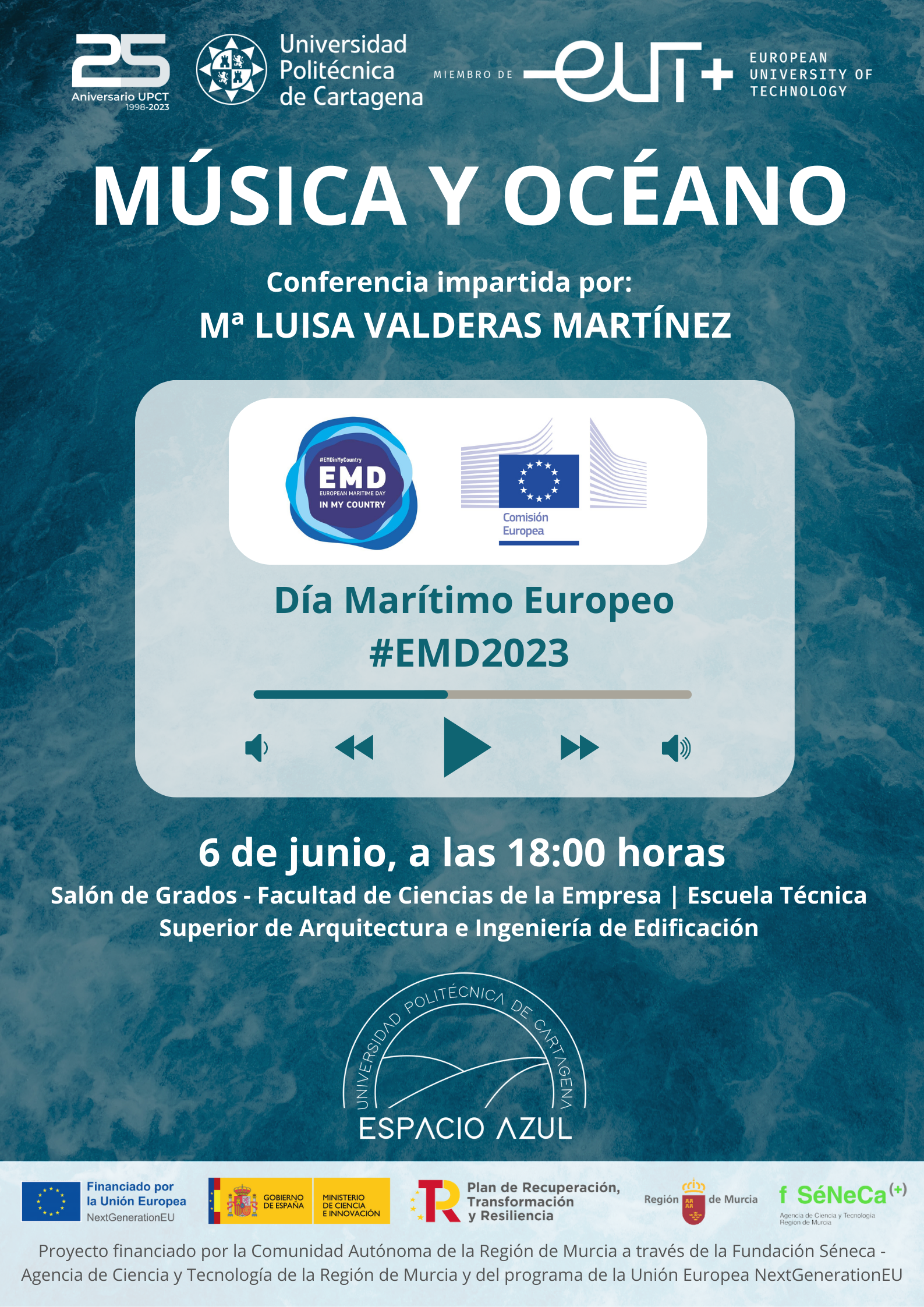 Un año más, la UPCT se suma a la celebración del Día Marítimo Europeo. En esta ocasión, a través de Espacio Azul UPCT que organiza la conferencia “Música y océano” a cargo de Mª Luisa Valderas, profesora del IES Isaac Peral de Cartagena. El evento tendrá lugar el martes, 6 de junio, a las 18 horas en el Salón de Grados del Edificio CIM (Calle Real, 3, Cartagena). La entrada será gratuita hasta completar aforo.